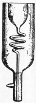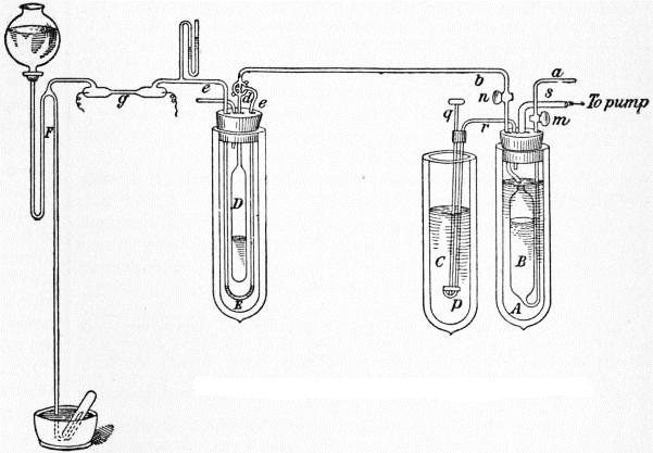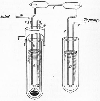 Vacuum Vessels.—The problem involved in the liquefaction of hydrogen was in reality a double one. In the first place, the gas had to be cooled to such a temperature that the change to the liquid state was rendered possible. In the second, means had to be discovered for protecting it, when so cooled, from the influx of external heat, and since the rate at which heat is transferred from one body to another increases very rapidly with the difference between their temperatures, the question of efficient heat insulation became at once more difficult and more urgent in proportion to the degree of cold attained. The second part of the problem was in fact solved first. Of course packing with non-conducting materials was an obvious expedient when it was not necessary that the contents of the apparatus should be visible to the eye, but in the numerous instances when this was not the case such measures were out of the question. Attempts were made to secure the desired end by surrounding the vessel that contained the cooled or liquid gas with a succession of other vessels, through which was conducted the vapour given off from the interior one. Such devices involved awkward complications in the arrangement of the apparatus, and besides were not as a rule very efficient, although some workers, e.g. Dr Kamerlingh Onnes, of Leiden, reported some success with their use. In 1892 it occurred to Dewar that the principle of an arrangement he had used nearly twenty years before for some calorimetric experiments on the physical constants of hydrogenium, which was a natural deduction from the work of Dulong and Petit on radiation, might be employed with advantage as well to protect cold substances from heat as hot ones from cold. He therefore tried the effect of surrounding his liquefied gas with a highly exhausted space. The result was entirely successful. Experiment showed that liquid air contained in a glass vessel with two walls, the space between which was a high vacuum, evaporated at only one fifth the rate it did when in an ordinary vessel surrounded with air at atmospheric pressure, the convective transference of heat by means of the gas particles being enormously reduced owing to the vacuum. But in addition these vessels lent themselves to an arrangement by which radiant heat could still further be cut off, since it was found that when the inner wall was coated with a bright deposit of silver, the influx of heat was diminished to one-sixth of the amount existing without the metallic coating. The total effect, therefore, of the high vacuum and silvering is to reduce the in-going heat to one-thirtieth part. In making such vessels a mercurial vacuum has been found very satisfactory. The vessel in which the vacuum is to be produced is provided with a small subsidiary vessel joined by a narrow tube with the main vessel, and connected with a powerful air-pump. A quantity of mercury having been placed in it, it is heated in an oil- or air-bath to about 200° C., so as to volatilize the mercury, the vapour of which is removed by the pump. After the process has gone on for some time, the pipe leading to the pump is sealed off, the vessel immediately removed from the bath, and the small subsidiary part immersed in some cooling agent such as solid carbonic acid or liquid air, whereby the mercury vapour is condensed in the small vessel and a vacuum of enormous tenuity left in the large one. The final step is to seal off the tube connecting the two. In this way a vacuum may be produced having a vapour pressure of about the hundred-millionth of an atmosphere at 0° C. If, however, some liquid mercury be left in the space in which the vacuum is produced, and the containing part of the vessel be filled with liquid air, the bright mirror of mercury which is deposited on the inside wall of the bulb is still more effective than silver in protecting the chamber from the influx of heat, owing to the high refractive index, which involves great reflecting power, and the bad heat-conducting powers of mercury.