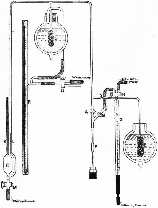 Density of Gases at Low Temperatures.—The ordinary mode of determining the density of gases may be followed, provided that the glass flask, with its carefully ground stop-cock sealed on, can stand an internal pressure of about five atmospheres, and that all the necessary corrections for change of volume are made. All that is necessary is to immerse the exhausted flask in boiling oxygen, and then to allow the second gas to enter from a gasometer by opening the stop-cock until the pressure is equalized. The stop-cock being closed, the flask is now taken out of the liquid oxygen and left in the balance-room until its temperature is equalized. It is then weighed against a similar flask used as a counterpoise. Following such a method, it has been found that the weight of 1 litre of oxygen vapour at its boiling point of 90.5° absolute is 4.420 grammes, and therefore the specific volume is 226.25 cc. According to the ordinary gaseous laws, the litre ought to weigh 4.313 grammes, and the specific volume should be 231.82 cc. In other words, the product of pressure and volume at the boiling point is diminished by 2.46%. In a similar way the weight of a litre of nitrogen vapour at the boiling point of oxygen was found to be 3.90, and the inferred value for 78° absolute, or its own boiling point, would be 4.51, giving a specific volume of 221.3.