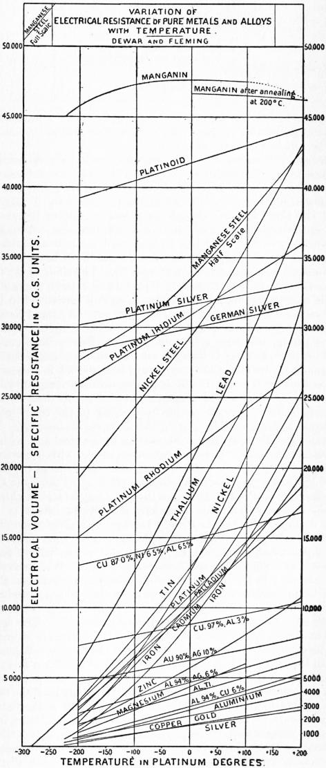 Density of Solids and Coefficients of Expansion at Low Temperatures.—The facility with which liquid gases, like oxygen or nitrogen, can be guarded from evaporation by the proper use of vacuum vessels (now called Dewar vessels), naturally suggests that the specific gravities of solid bodies can be got by direct weighing when immersed in such fluids. If the density of the liquid gas is accurately known, then the loss of weight by fluid displacement gives the specific gravity compared to water. The metals and alloys, or substances that can be got in large crystals, are the easiest to manipulate. If the body is only to be had in small crystals, then it must be compressed under strong hydraulic pressure into coherent blocks weighing about 40 to 50 grammes. Such an amount of material gives a very accurate density of the body about the boiling point of air, and a similar density taken in a suitable liquid at the ordinary temperature enables the mean coefficient of expansion between +15° C. and −185° C. to be determined. One of the most interesting results is that the density of ice at the boiling point of air is not more than 0.93, the mean coefficient of expansion being therefore 0.000081. As the value of the same coefficient between 0° C. and −27° C. is 0.000155, it is clear the rate of contraction is diminished to about one-half of what it was above the melting point of the ice. This suggests that by no possible cooling at our command is it likely we could ever make ice as dense as water at 0° C., far less 4° C. In other words, the volume of ice at the zero of temperature would not be the minimum volume of the water molecule, though we have every reason to believe it would be so in the case of the majority of known substances. Another substance of special interest is solid carbonic acid. This body has a density of 1.53 at −78° C. and 1.633 at −185° C., thus giving a mean coefficient of expansion between these temperatures of 0.00057. This value is only about 1⁄6 of the coefficient of expansion of the liquid carbonic acid gas just above its melting point, but it is still much greater at the low temperature than that of highly expansive solids like sulphur, which at 40° C. has a value of 0.00019. The following table gives the densities at the temperature of boiling liquid air (−185° C.) and at ordinary temperatures (17° C.), together with the mean coefficient of expansion between those temperatures, in the case of a number of hydrated salts and other substances: