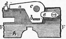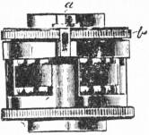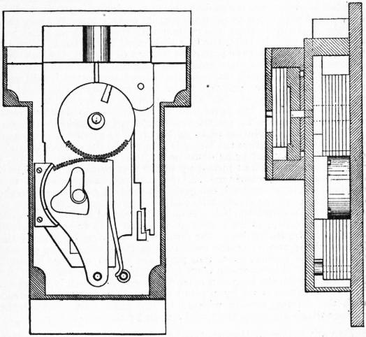 Walker’s Neptune log (fig. 6) is used for vessels of high speed. Case A contains the wheelwork, and case E the spindle and steel ball bearings; in each case are openings, closed by sliding tubes, for examination and lubrication. In fig. 6 the cases A and E are shown open. Fig. 7 shows the dial plate. In fig. 8 the ball bearings are shown unscrewed from the body of the log, with eye, cap and spindle. They consist of two rows of balls rolling in two pairs of V races or grooves. The outer pair receive the strain of the rotator, and the inner are for adjustment and to prevent lateral movement. The balls and races are enclosed in a skeleton cage (fig. 9) unscrewing from the cap F (fig. 6) for cleaning or renewal; the adjustment of the bearings is made by screwing up the cage cap b, locked by a special washer and the two screws a, a (figs. 8, 9). If the outer races become worn, the complete cage and bearings are reversed; the strain of the line is then transferred to what had previously been the inner with practically unworn balls and races. It is for this purpose that the skeleton cage is screwed internally at both ends, fitting a screwed ring inside the cap F (fig. 6). To enable the indications of the log register on the taffrail to be recorded in the chart room or any other part of the vessel as desired, a chart room electric register has been introduced. By means of an electric installation between the log register aft and the electric register in the chart room, every tenth of a mile indicated by the former is recorded by the latter.
