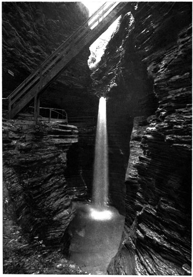 A few miles to the southeast is Monument Mountain, the Indian "Fisher's Nest," one of the most curious and attractive of the Berkshire hills on account of its position and form, although the summit is not very high, less than thirteen hundred feet. Its rock formations are fine, being of white quartz, and on the eastern side is a detached cliff with a huge pinnacle nearly a hundred feet high, known as the "Pulpit." Hawthorne greatly admired this mountain, at which he looked from his boudoir window across the lake, and in its autumn hues he said it appeared like "a headless sphinx wrapped in a rich 258 Persian shawl," seen across a valley that was "a vast basin filled with sunshine as with wine." The mountain received its modern name from a cairn found on the summit, the tradition telling of a mythical Indian maiden who got crossed in love, and as a consequence jumped off the topmost cliff, being dashed to pieces. Her tribe, when they passed that way, each added a stone to the pile, thus building the cairn. There are many stones thrown all around this peculiarly rugged mountain, which is piled up with white marble crags in a region where abrupt peaks are seen almost everywhere. In among these cliffs is the Ice Glen, a cold and narrow cleft where ice may be found in midsummer, it is so secluded from sunshine. The appearance of Monument Mountain made a strong impression on William Cullen Bryant, who thus described it: