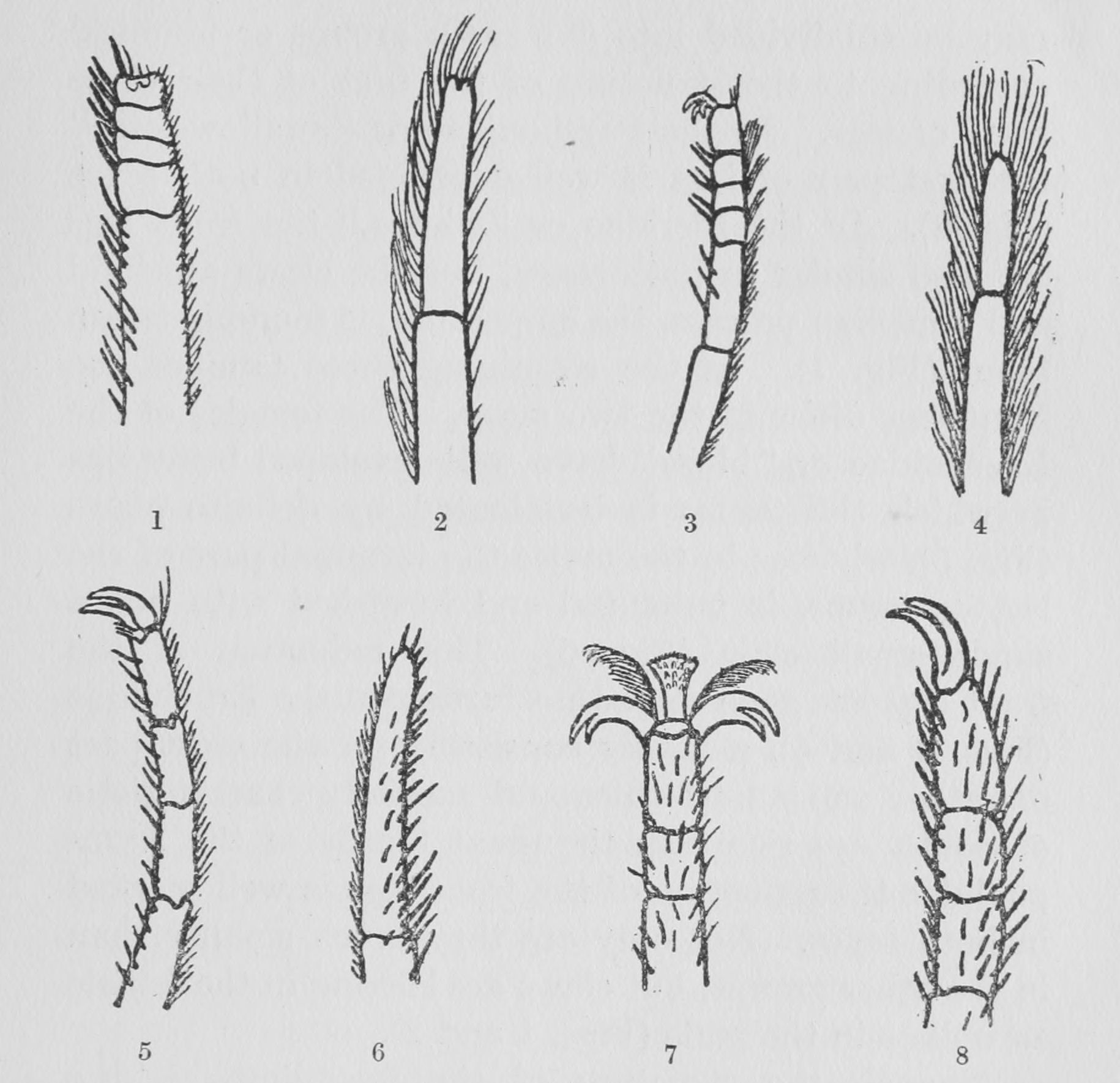 Figs. 1-8. Terminal portion of front legs of butterflies belonging to different families. (After Eltringham.)