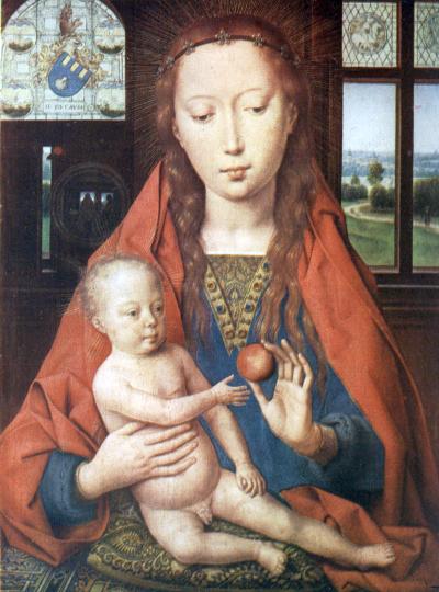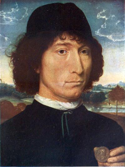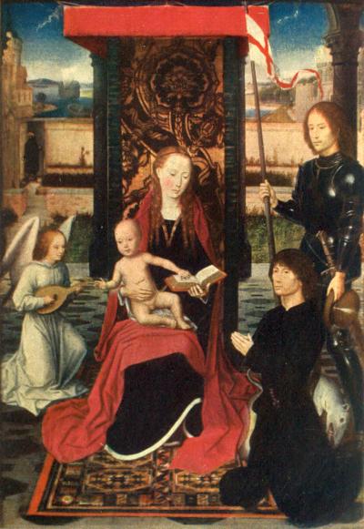 This, the central panel of an altarpiece, painted in 1484 for William Moreel, Burgomaster of Bruges, is now in the Town Gallery at Bruges.