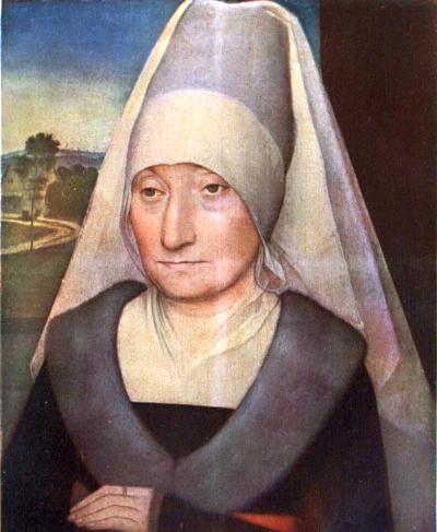 If in these pages attention has perhaps been somewhat too exclusively devoted to the portraits of men left us by Memlinc, obviously enough because of the greater interest they excite by the stories known of their careers, it must not be supposed that he proved himself less skilful as a portrayer of women. As a rule the wives of the donors in his pictures are of the homely type, but they appeal to us none the less as typical examples of the womankind of a burgher community in which the virtues of the home were cherished and sedulously cultivated. Two exceptionally fine specimens of male and female portraiture, which most likely belong to this period, are the bust of an old man in the Royal Museum at Berlin and that of an aged lady, recently acquired by the Louvre for the very substantial sum of 200,000 francs. If, as has been suggested, these are portraits of husband and wife, it is regrettable that they should have strayed so far apart, but the latter we have selected for illustration as perhaps the best available example to demonstrate Memlinc’s aptitude for the interpretation of the dignity of old age in woman.