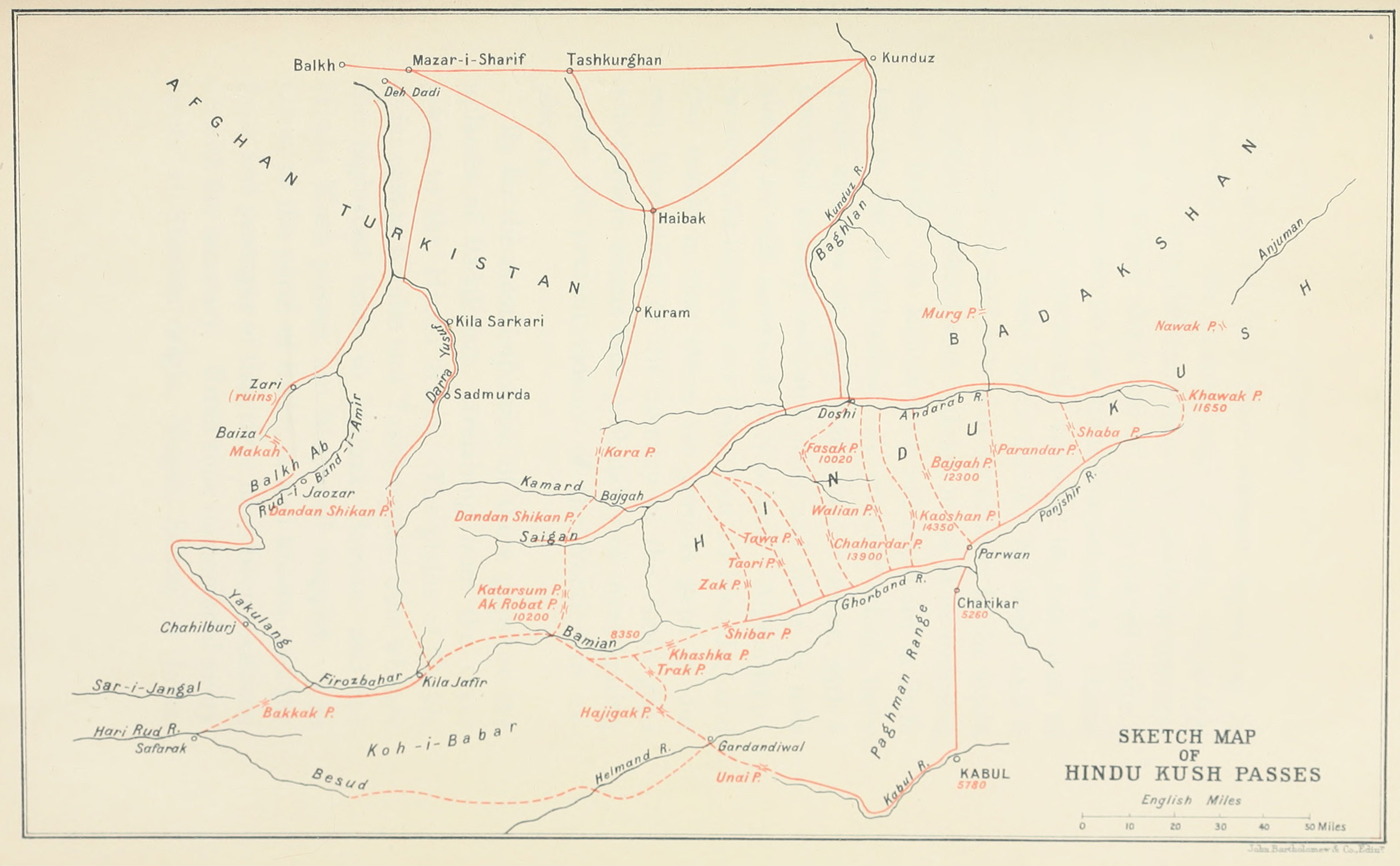 Beyond the Dorah to the westward, following the Kafiristan divide of the Hindu Kush, we may well leave unassisted Nature to maintain her own work of perfect defence, for there is not a track that we can discover to exist, nor a by-way that we can hear of which passes through that inconceivably grand and savage wilderness of untamed mountains. Undoubtedly such tracks exist, but judging from the remarkable physical constitution of the Kafir, they are such as to demand an exceptional type of mountaineer to deal with them. It is only when we work our way farther westward to those passes which lead into the valleys of the upper Kabul River affluents, from the Khawak Pass at the head of the Panjshir valley to the Unai which points the way from Kabul to Bamian, that we find material for sober reflection derived from the records of the past.
