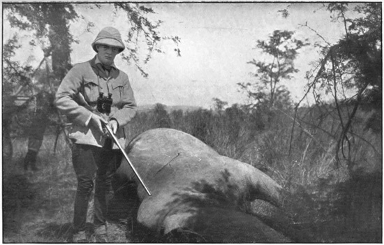 We changed our position by a flank march of admirable celerity, and from the top of a neighbouring ant-bear hill watched, at the distance of about one hundred and fifty yards, the stately and awe-inspiring procession of eleven elephants. On they came, loafing along from foot to foot—two or three tuskers of no great merit, several large tuskless females, and two or three calves. On the back of every elephant sat at least one beautiful white egret, and sometimes three or four, about two feet high, who pecked at the tough hide—I presume for very small game—or surveyed the scene with the consciousness of pomp. These sights are not unusual to the African hunter. Those who dwell in the wilderness are the heirs of its wonders. But to me I confess it seemed a truly marvellous and thrilling experience to wander through a forest peopled by these noble Titans, to watch their mysterious, almost ghostly, march, to see around on every side, in large trees snapped off a few feet from the ground, in 182 enormous branches torn down for sport, the evidences of their giant strength. And then, while we watched them roam down towards the water, I heard a soft swishing sound immediately behind us, and turning saw, not forty yards away, a splendid full-grown rhinoceros, with the long, thin horn of his rare tribe upon him—the famous white rhinoceros—Burchell himself—strolling placidly home after his evening drink and utterly unconscious of the presence of stranger or foe!