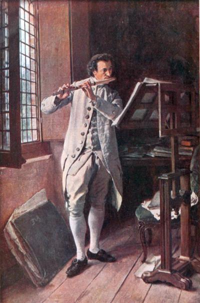 Meissonier’s erudition was such that it enabled him to combine the skill of the artist with the utmost fidelity in details of costume. In the Flute-player, the artist predominates. This figure, with foot slightly raised in the act of beating time, is admirably life-like.