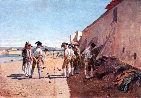 This curious composition represents some Spanish soldiers playing bowls outside the city wall. The painting, which is hardly larger than the accompanying reproduction, is a little masterpiece of actuality, and the people in it move in a thoroughly faithful landscape, lit by the warm sunlight of Spain.