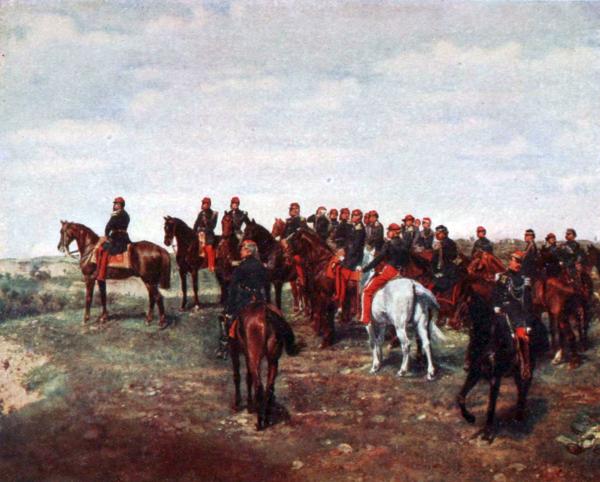 “The latter undertook to show my painting to the Emperor, and to that end secured me an invitation to go to Fontainebleau. Napoleon III. received me cordially, and after spending a long time in studying my picture, in which only one figure was now lacking, he inquired who, according to my idea, that missing figure should be. ‘Why, you, Sire.’ ‘Then you are going to paint my portrait?’ he remarked.[Pg 65] ‘How will you do that?’ ‘From memory, and with the help of published documents.’ ‘But all that is not equal to a single sitting,’ replied the Emperor. ‘Do you not agree with me, M. Meissonier?’ ‘Undoubtedly, Sire, but—’ ‘Very well, nothing is simpler, let us both mount our horses, and go for a short ride, and while we chat, you can study me at your leisure.’