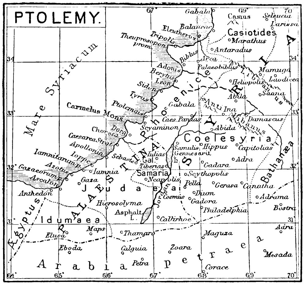 [1] The latitudes and longitudes given by Ptolemy (see Reland’s Palestina Illustrata, p. 456-466) are not reliable. Those nearest the coast are the most correct; those farther east are very wild. The little sketch given above sufficiently illustrates this.