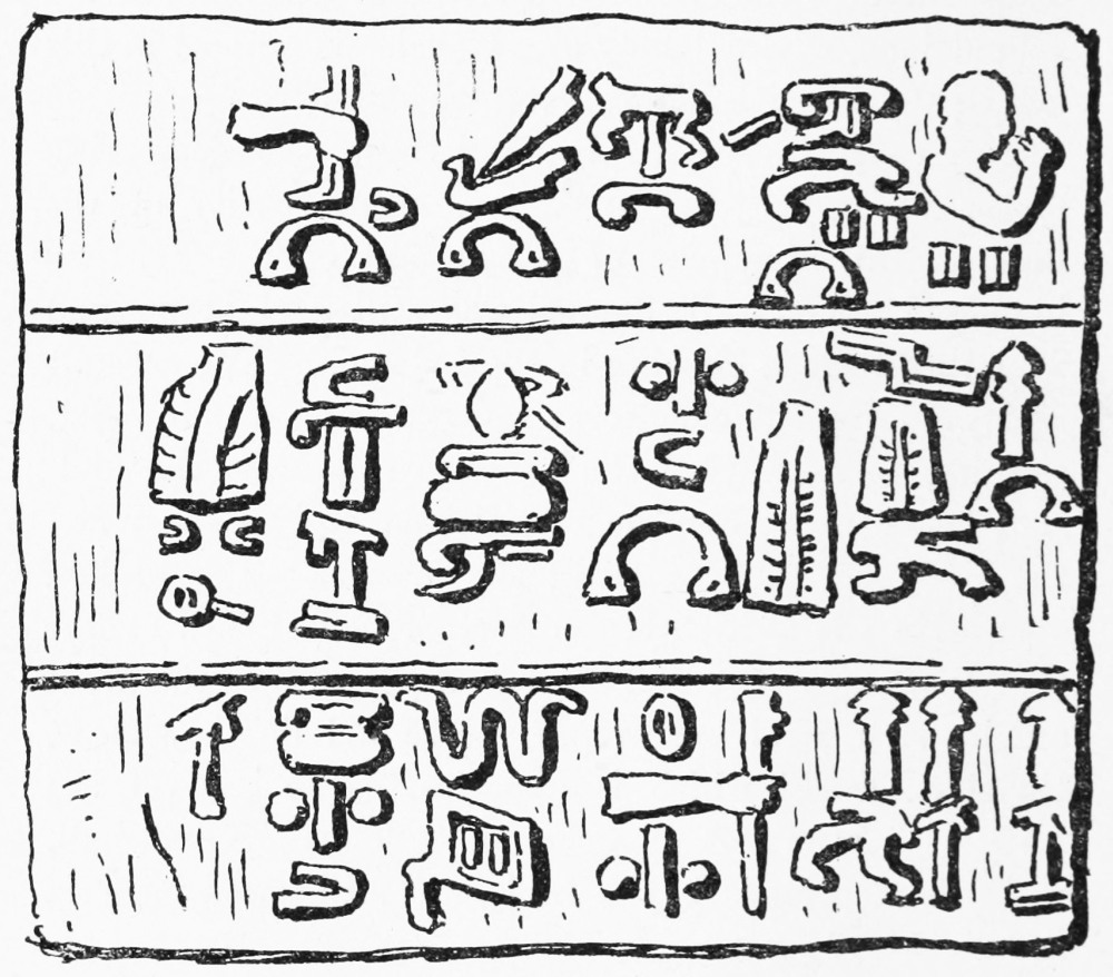 [64] The so-called “Hittite” system. The monuments in this character as yet found in situ occur in Armenia, Asia Minor, and Northern Syria. The most southerly sculpture of the kind yet known was discovered in a mound near Damascus excavated by Sir C. W. Wilson. The earliest found examples were five stones at Hamath, one of which Buckhardt saw. Other examples were discovered at Aleppo, and by George Smith at Carchemish. The system as at present known includes about 130 signs, some fifty of which are very frequently repeated. There is no doubt that these read (like the early Akkadian texts) in lines with syllables arranged in columns. Some of the emblems resemble those found in the earliest examples of other Asiatic systems (Egyptian, Akkadian, and Old Chinese), and by analogy it is probable that each emblem represents a word—noun, verb, or other grammatical form. My reasons for supposing the language to be a Turkic or Mongolic dialect are simple. 1st, The names of Hittites and Hittite cities known to us appear to be in such a dialect; 2nd, the short bilingual agrees with this view; and 3rd, the commonest signs (of which we know the sound through later hieratic forms) can be shown to represent common Mongolic words, such as pronouns and case-endings, &c. Many other suggestions have been made for comparing with Hebrew, Georgian, Armenian, and Egyptian, but in no case has it been shown that these languages supply a key to the sounds or to the bilingual. Take, for instance, the Hittite royal title Tarku. It exists only in the Turanian languages—Turkic Tarkan, Mongol Dargo, Cossack Turughna, Etruscan Tarchu and Tarquin, all meaning “a chief.” The number of words which I have so compared now amounts to a hundred in all, and I believe it places the character of the language on a sound and scientific basis.—See Journal Anthropological Institute, August 1889.