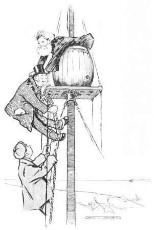 "This enormous barrel was erected in the great Industrial Exhibition held at Osaka, Japan. It is the property of the 'Yebisu' Beer Company, and was built for the purpose of advertising that brand of malt liquor. The height is about fifty feet and the diameter of its base some thirty feet, while the thickness of its wall exceeds two feet. It is fitted up as a beer hall within and contains ten round tables, each capable of accommodating five or six persons. There is also a large counter. It is one of the most remarkable of the many advertising devices ever carried out in this enterprising 'Land of the Rising Sun.' The photograph was taken by Mr. G. M. Arab, of this city."—Mr. W. J. Toms, Kobé, Japan.