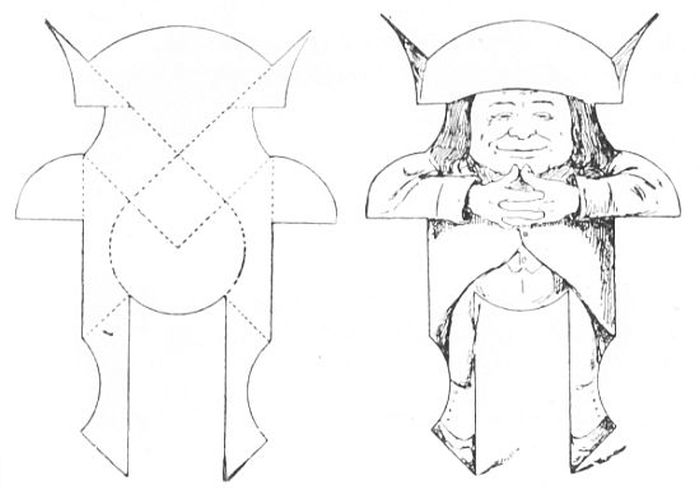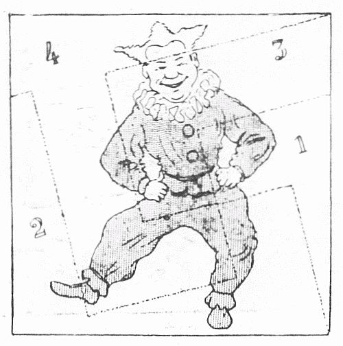 "This figure of the dwarf, taken at an evening party in Kimberley, South Africa, was impersonated by my brother and a friend as follows: My brother stood upright with his hands on a table (these forming the feet of the dwarf), on which were placed stockings and small shoes. He had a little garment made with sleeves, through which his friend, who stood just behind, put his arms and hands, on which were mittens to make them look small; these formed the hands of the dwarf. My brother was adorned with a large sun hat called a 'cappie,' goggles, and a necklace, and the dwarf was complete—his friend, of course, being concealed by curtains."—Mr. F. E. Glover, 41, Drayton Park, Highbury, N.