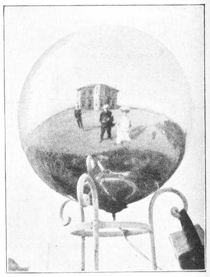 "While staying in Jersey I visited a point called La Corbière, where I noticed a mirror in the form of a ball standing out in the open on a pedestal. Objects reflected in it were so clear that I determined to photograph it, with the result that rather curious shapes were given to myself and friend." Mr. C. S. Wilson, 18, Milton Road, Swindon.