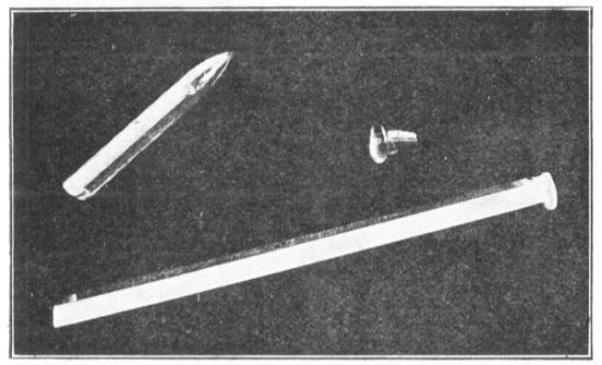 "I was cutting the corner off a gammon of bacon when I discovered I had sawn through a piece of glass which was lying quite close to and parallel with the thigh-bone, and had I known of its presence I could have taken it out whole. It measures, when put together, six and a quarter inches. How it got into this position is a mystery, as there was no indication of its progress anywhere and the meat was perfectly healthy and in no way discoloured. Whether the poor pig swallowed it or sat on it I leave for your readers to conjecture. Photo, by W. B. Gardner, Farnborough."—Mr. W. J. Buck, Cove Road, Farnborough, Hants.