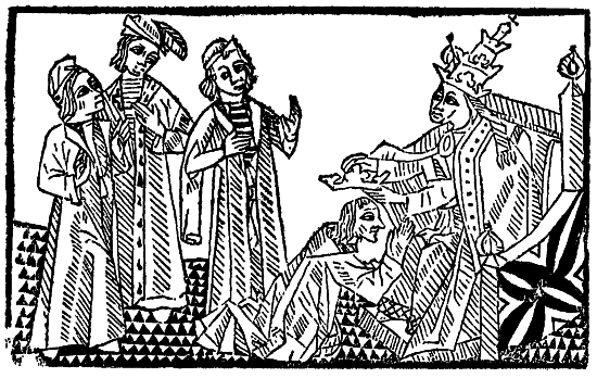 | Comment le roy fut admonnesté de la royne clotildis affectueusement qu'il deust croire en la foy crestienne et autres matieres. | Le .iii. chapitre. |