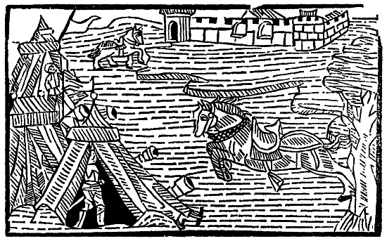 Après cecy devant dit le roy de cibille et le roy de corduble vont mander a charles s'il vouloit venir a corduble pour batailler Tantost que charles le sceut a toute sa puissance il vint celle part. Et quant ilz furent près pour batailler les sarrazins firent une chose moult sauvaige. car devant les hommes sarrazins qui estoient a cheval ilz vont ordonner des gens de pié qui pourtoient des visaigieres contrefaictes toutes noires et rouges cornues et barbues comme diables. car ilz ne pouvoient aultrement en bonne maniere faire contrarieté aux crestiens. mais s'aviserent de faire dissimulacions. et chascun des pietons sarrazins deguisez portoit en sa main une clochette ou une campane. Et a l'entree de ceste bataille ilz commencerent a sonner et faire bruit tellement que tantost que les chevaulx des crestiens les virent ainsi contrefaitz et ainsi sonner impetueusement ilz commencerent a fouyr et desrenger et esprouver en telle maniere que personne ne les pouvoit tenir. mais force fut d'eulx en fouyr et retraire. Charles se avisa de remede il fit lendemain mettre des drappeaulx devant les yeulx des chevaulx qu'ilz ne virent riens. et fit boucher et aussi estouper leurs oreilles. affin qu'ilz ne peussent veoir ne escouter ces sarrazins deguisez et contrefaitz. Et quant en celle maniere ilz vindrent en la bataille ilz ne firent sinon les mettre a mort jusques a midy. mais non pas qu'ilz fussent du tout vaincus. car ilz avoyent ung char gros et fait pour faire grant empesche a resister a leurs ennemys. et si fort conduisoyent celluy engin a .viii. beufz qui l'emenoyent en guerre et estoit dessus en hault l'estandart de leur enseigne. et avoyent de coustume que sur peine de mourir personne ne retournast arriere ne reculast pour riens entretant que l'estandart seroit droit. De cecy fut informé charles pourquoy moult puissamment il se mist parmy les sarrazins tellement qu'il vint a l'estandart et a tout joyeuse son espee il couppa: cecy voyant les sarrazins de fouyr. et furent des payens plusieurs mortz et occis. Et puis le lendemain la ville fut remise a charles par le seigneur du lieu qui ne luy pouvoit resister. Et après charles fut content de luy laisser la vie s'il se vouloit baptiser et la ville aussi mais qu'il la tenist de luy. Et adonc charles ordonna en espaigne de ces barons par maniere que nul ne l'osast plus assaillir a faire guerre. car tousjours se trouvoit victorieux de ses ennemys par la puissance qu'il menoit et par la discrecion de sa personne et par la grace de dieu qui ne fault pas a subvenir a ses amys.