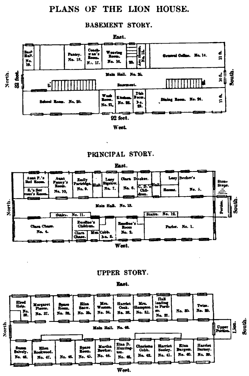 The plans of the Lion House are difficult to read. Below is an ascii representation of the plans along with a key to the rooms. If what you see is illegible, try downloading the text or html version of this ebook.