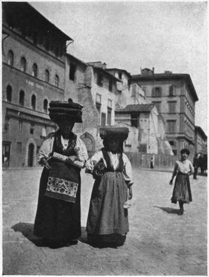 The signora's dark eyes flashed, the Spanish mantilla upon her head shook in sympathy with the violence of her emotions, as she repeated her vocabulary of epithets. We were thankful that four stories separated the combatants, and retiring under the shadow of a doorway we anxiously awaited results. Something happened, we know not what; the fruit may have been reduced the fraction of a penny; whatever it was, a truce was declared, during which the signora's basket, filled with fruit and artichokes, was drawn up to the window by a rope. After the lady had carefully inspected each individual fruit and vegetable, she smiled blandly, lowered some money in her basket, and the pair parted with bows and compliments. Juliet on her balcony could not have been more graceful, nor Romeo on the pavement below more gallant than this shabby venditore, as he swept the ground with his cap, one hand upon his heart!