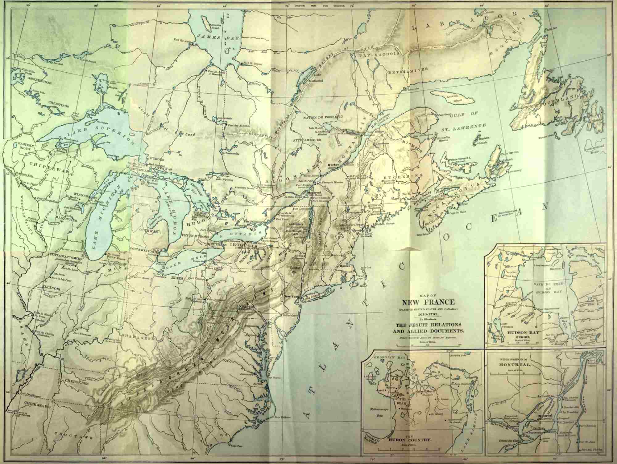 This extra copy of the "MAP OF NEW FRANCE, 1610-1791," is sent, with the compliments of THE BURROWS BROTHERS COMPANY, to subscribers to "THE JESUIT RELATIONS AND ALLIED DOCUMENTS." It may be found convenient in consulting volumes subsequent to Volume I.