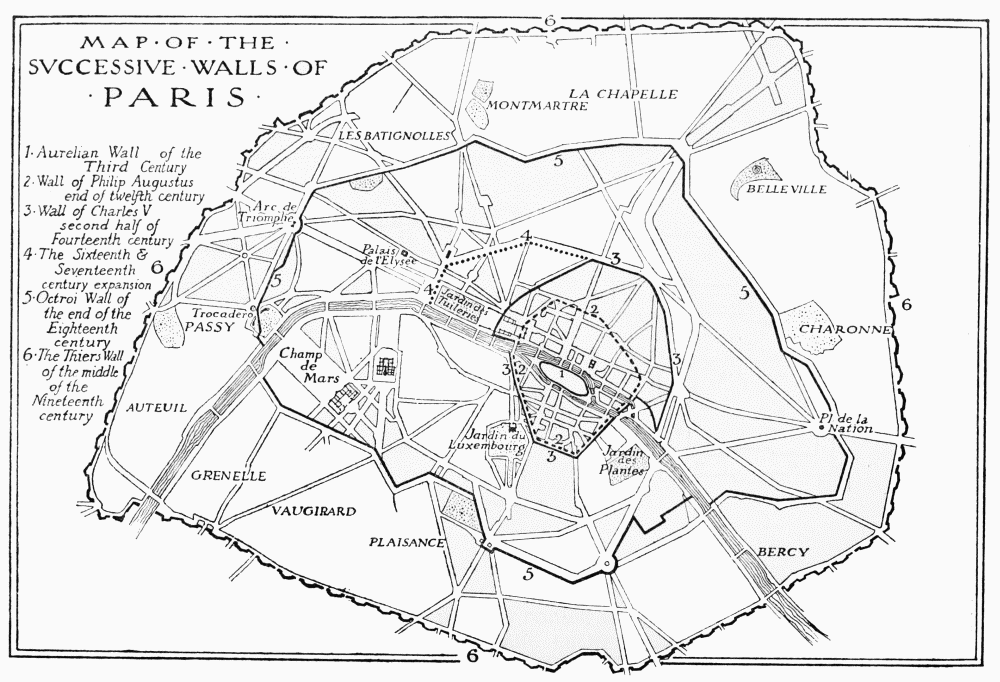 The story of Paris presents a marked contrast with that of an Italian city-state whose rise, culmination and fall may be roundly traced. Paris is yet in the stage of lusty growth. Time after time, like a young giantess, she has burst her{vi} cincture of walls, cast off her outworn garments and renewed her armour and vesture. Hers are no grass-grown squares and deserted streets; no ruined splendours telling of pride abased and glory departed; no sad memories of waning cities once the mistresses of sea and land; none of the tears evoked by a great historic tragedy; none of the solemn pathos of decay and death. Paris has more than once tasted the bitterness of humiliation; Norseman, and Briton, Russian and German have bruised her fair body; the dire distress of civic strife has exhausted her strength, but she has always emerged from her trials with marvellous recuperation, more flourishing than before.
