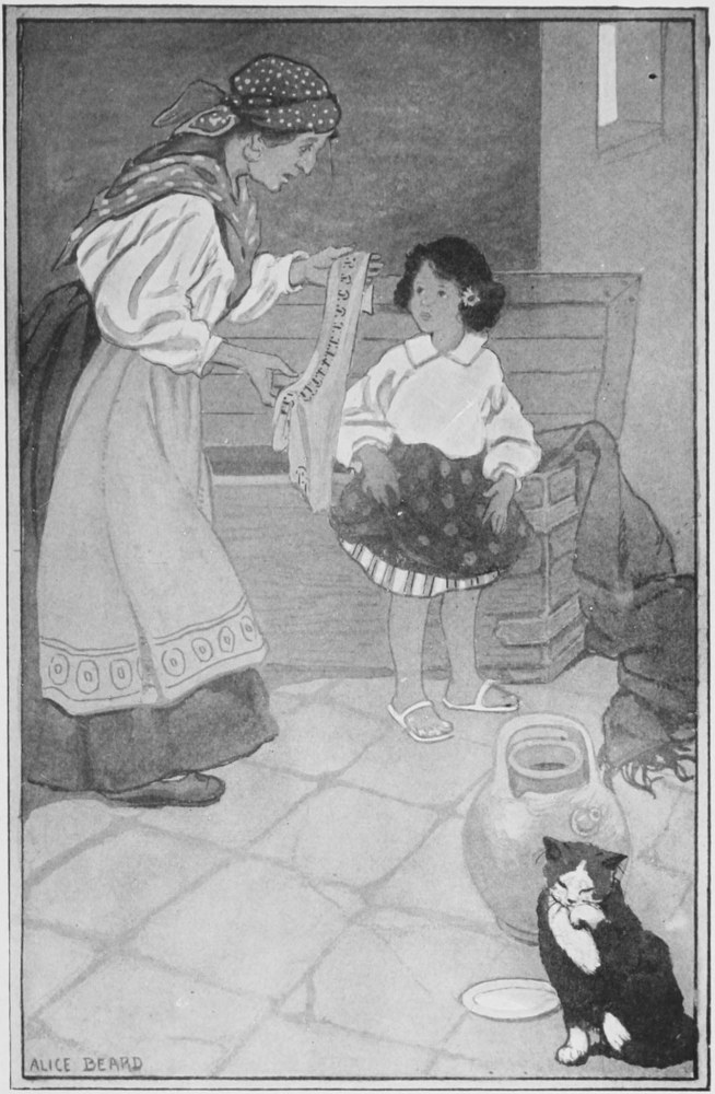 And Tia Marta thrust the strip of linen back to Pilarica with such a jerk that the needle flew off the thread, slid to the floor and, after a merry hop or two, hid itself in a crack. This was fun for the needle, but it kept Pilarica away from the garden for ten minutes more while her small palms rubbed over the worn, uneven tiles in anxious search. But as soon as she knelt down and prayed to Santa Rita, the clever saint who can find anything that is lost, the needle gave her knee a saucy prick and consented, after its run-away frolic, to be stuck into the cloth again. For, you see, the needle had been working hard, too, and wanted its bit of holiday as much, perhaps, as Pilarica wanted hers.