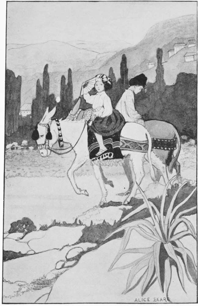 But although Rafael was not fortunate in finding the buried treasure of the Moors, he was always coming upon buried treasure of Pilarica’s, to her great indignation and concern. All over the garden were hidden her little hoards of such childish wealth as Tia Marta’s well-worn broom would send spinning out of the house,—fragments of ruddy pottery, bits of sunrise-hued mosaic, choice feathers shed by the garden birds, feathers that might some day be fashioned into a fan, beads and ribbons that had come traveling up the Alhambra hill in Rodrigo’s pocket when there chanced to be a fair going on in Granada.