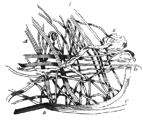 What makes it probable that the labour-pains proceed only from the dilatation of the [281] orifice of the matrix is, that this dilatation is the only means to discover whether the pains felt are in fact the pains of labour, for women often feel very sensible pains, which are not those that immediately precede delivery. To distinguish the false from true pains, it has been recommended for the midwife to touch the orifice of the matrix, as if the pains be true the dilatation will always increase, and if they are false pains, that is to say, pains which proceed from some other cause than that of the approaching delivery, the orifice will contract rather than dilate, or at least will not continue to dilate. From hence we have sufficient foundation to imagine, that these pains proceed from a forced dilatation of the orifice. The only thing which embarrasses on this occasion is that alternative of rest and sufferings the mother endures. This circumstance of the effect does not perfectly agree with the cause which we have just indicated; for the dilatation of an orifice, which is made by degrees, should produce a constant and continued pain, without any intervals of ease. But possibly the whole may be attributed to the separation of the placenta, which we know is fastened to the matrix by a number of papillæ, which penetrate [282] into the vacuities or cavities of this viscera; therefore may it not be supposed that they do not separate from their cavities all at the same time; that each separation causes those acute pains, and the intervals between are those of ease and rest? The effect in this case perfectly answers the cause, and we can support this conjecture by another observation.—Immediately before delivery there issues a whitish and viscous liquor, like that which flows from the nipples of the placenta when drawn out of their places, which makes it probable that this liquor, which then issues from the matrix, is produced by the separation of some of the papillæ of the placenta.