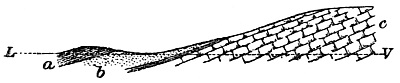 The transmission of water through a porous medium being so rapid, we may easily understand why springs are thrown out on the side of a hill, where the upper set of strata consist of chalk, sand, and other permeable substances, whilst those lying beneath are composed of clay or other retentive soils. The only difficulty, indeed, is to explain why the water does not ooze out everywhere along the line of junction of the two[2] formations, so as to form one continuous land-soak, instead of a few springs only, and these oftentimes far distant from each other. The principal cause of such a concentration of the waters at a few points is, first, the existence of inequalities in the upper surface of the impermeable stratum, which lead the water, as valleys do on the external surface of a country, into certain low levels and channels; and secondly, the frequency of rents and fissures, which act as natural drains. That the generality of springs owe their supply to the atmosphere is evident from this, that they vary in the different seasons of the year, becoming languid or entirely ceasing to flow after long droughts, and being again replenished after a continuance of rain. Many of them are probably indebted for the constancy and uniformity of their volume to the great extent of the subterranean reservoirs with which they communicate, and the time required for these to empty themselves by percolation. Such a gradual and regulated discharge is exhibited, though in a less perfect degree, in all great lakes, for these are not sensibly affected in their levels by a sudden shower, but are only slightly raised, and their channels of efflux, instead of being swollen suddenly like the bed of a torrent, carry off the surplus water gradually.