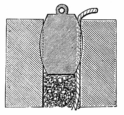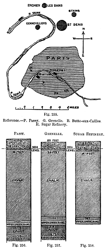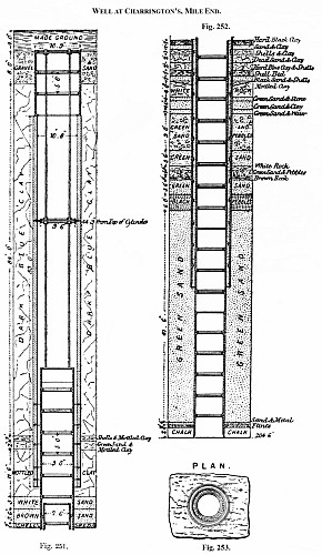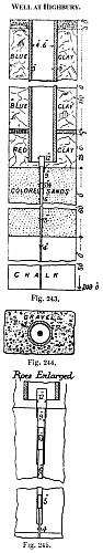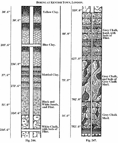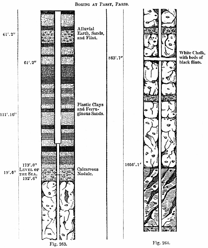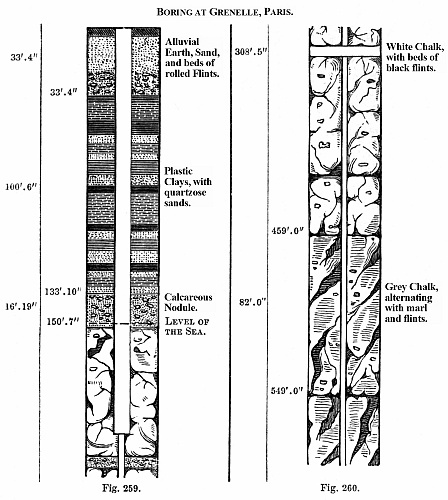It will be obvious how, in this way, by passing under a mass[7] of drift the water descending from the top of hill slopes reappears at their foot in the form of springs. If now we suppose these issues stopped, or covered by an impervious stratum of great thickness, and this stratum pierced by a boring, the water will ascend through this new outlet to a level above that of its original issue, in virtue of the head of water measured from the points at which the infiltration takes place to the point in which it is struck by the boring.