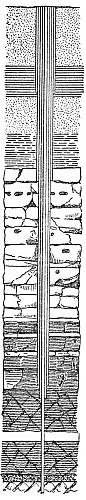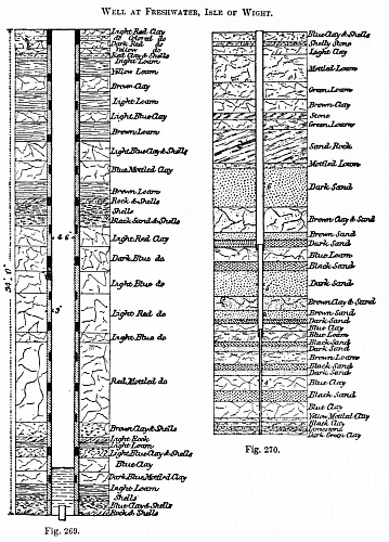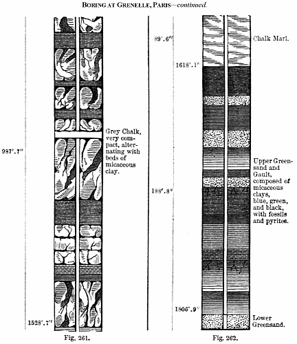For the purposes under consideration, we may range the various strata of which the outer crust of the earth is composed under four heads, namely: 1, drift; 2, alluvion; 3, the tertiary and secondary beds, composed of loose, arenaceous and permeable strata, impervious, argillaceous and marly strata, and thick strata of compact rock, more or less broken up by fissures, as the Norwich red and coralline crag, the Molasse sandstones, the Bagshot sands, the London clay, and the Woolwich beds, in the tertiary division; and the chalk, chalk marl, gault, the greensands, the Wealden clay, and the Hastings sand; the oolites, the has, the Rhætic beds, and Keuper, and the new red sandstone, in the secondary division; and 4, the primary beds, as the magnesian limestone, the lower red sand, and the coal measures, which consist mainly of alternating beds of sandstones and shales with coal.