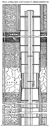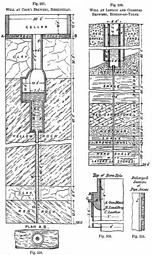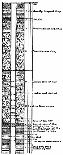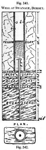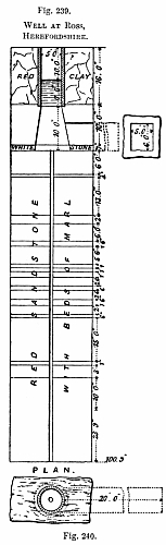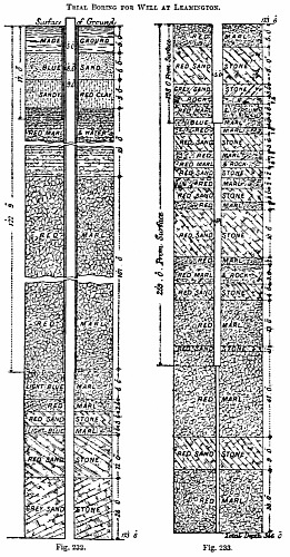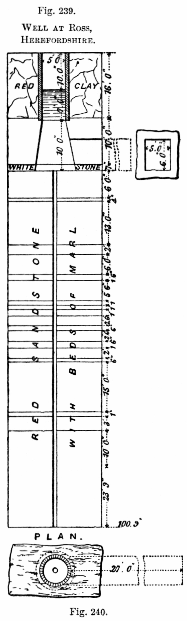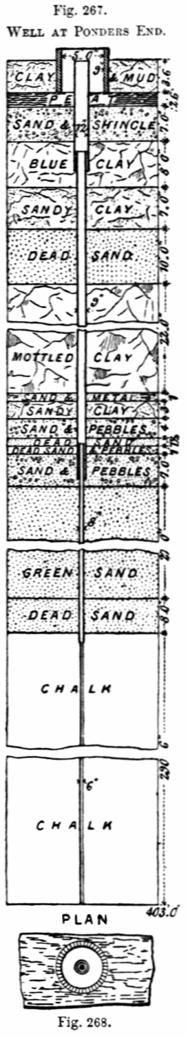 The next strata in which water is found are the upper and inferior oolites, between which are the Kimmeridge and Oxford clays, which are separated by the coral rag. There are instances in which the Oxford clay is met with immediately below the Kimmeridge, rendering any attempt at boring useless, because the water in the Oxford clay is generally so impure as to be unfit for use. And with regard to finding water in the oolitic limestone, it is impossible to determine with any amount of precision the depth at which it may be reached, owing to the numerous faults which occur in the formation. It will therefore be necessary to employ the greatest care before proceeding with any borings. Lower down in the order are the upper has, the marlstone, the lower has, and the new red sandstone. In the marlstone, between the upper and lower beds of the has, there may be found a large supply of water, but the level of this is as a rule too low to rise to the surface through a boring. It will be necessary to sink shafts in the ordinary way to reach it. In the new red sandstone, also, to find the water, borings must be made to a considerable depth, but when this formation exists[9] a copious supply may be confidently anticipated, and when found the water is of excellent quality.