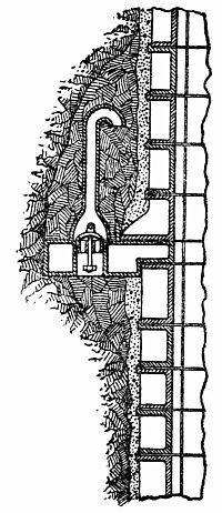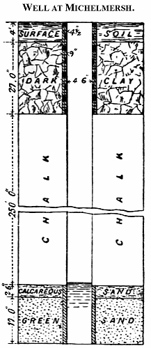 The strata of the tertiary and secondary beds, especially the latter, are far more extensive than the preceding, and yield much larger quantities of water. The chalk is the great water-bearing stratum for the larger portion of the south of England. The[8] water in it can be obtained either by means of ordinary shafts, or by Artesian wells bored sometimes to great depths, from which the water will frequently rise to the surface. It should be observed that water does not circulate through the chalk by general permeation of the mass, but through fissures. A rule given by some for the level at which water may be found in this stratum is, “Take the level of the highest source of supply, and that of the lowest to be found. The mean level will be the depth at which water will be found at any intermediate point, after allowing an inclination of at least 10 feet a mile.” This rule will also apply to the greensand. This formation contains large quantities of water, which is more evenly distributed than in the chalk. The gault clay is interposed between the upper and the lower greensand, the latter of which also furnishes good supplies. In boring into the upper greensand, caution should be observed so as not to pierce the gault clay, because water which permeates through that system becomes either ferruginous, or contaminated by salts and other impurities.