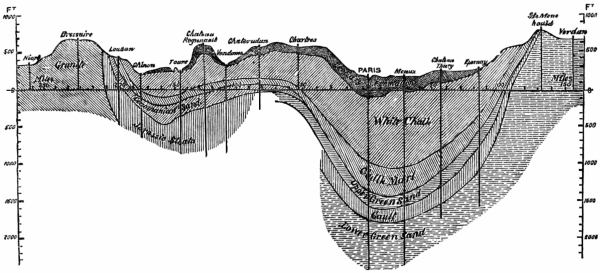 If the strata consist of sand, water will pass through them[12] with facility, and they will also hold a considerable quantity between the interstices of their component grains; whereas a bed of pure clay will not allow of the passage of water. These are the two extremes of the case; the intermixture of these materials in the same bed will of course, according to their relative proportions, modify the transmission of water. Prestwich found by experiment that a silicious sand of ordinary character will hold on an average rather more than one-third of its bulk of water, or from two to two and a half gallons in one cubic foot. In strata so composed the water may be termed free, as it passes easily in all directions, and under the pressure of a column of water is comparatively but little impeded by capillary attraction. These are the conditions of a true permeable stratum. Where the strata are more compact and solid, as in sandstone, limestone, and oolite, although all such rocks imbibe more or less water, yet the water so absorbed does not pass freely through the mass, but is held in the pores of the rock by capillary attraction, and parted with very slowly; so that in such deposits water can be freely transmitted only in the planes of bedding and in fissures. If the water-bearing deposit is of uniform lithological character over a large area, then the proposition is reduced to its simplest form; but when, as in the deposit between the London clay and the chalk, the strata consist of variable mineral ingredients, it becomes essential to estimate the extent of these variations; for very different conclusions might be drawn from an inspection of the Lower Tertiary strata at different localities.