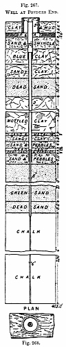 In this latter section the mottled clays have nearly disappeared, and are replaced by beds of sand with thin seams of mottled clays. At Twyford, near Reading, and at Old Basing, near Basingstoke, the mottled clays again occupy, as at Hedgerley, nearly the whole space between the London clays and the chalk. Near Reading a good section of these beds was exhibited in the Sonning cutting of the Great Western Railway; they consisted chiefly of mottled clays. At the Katsgrove pits, Reading, the beds are more sandy. Referring back to Fig. 6, it may be noticed that there is generally a small quantity of water found in the bed marked 1, in parts of the neighbourhood of London. Owing, however, to the constant presence of green and ferruginous sands, traces of vegetable matters and remains of fossil shells, the water is usually indifferent and chalybeate. The well-diggers term this a slow spring. They well express the difference by saying that the water creeps up from this stratum, whereas that it bursts up from the lower sands 3, which is the great water-bearing stratum. In the irregular sand-beds interstratified with the mottled clays between these two strata water is also found, but not in any large quantity.