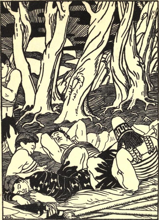 Thus sailed we forward a day and a night with a prosperous wind, and as long as we had any sight of land, made no great haste on our way; but the next morrow about sun rising the wind blew high and the waves began to swell and a darkness fell upon us, so that we could not see to strike our sails, but gave our ship over to the wind and weather; thus were we tossed in this tempest the space of threescore and nineteen days together. On the fourscorth day the sun upon a sudden brake out, and we descried not far off us an island full of mountains and woods, about the which the seas did not rage so boisterously, for the storm was now reasonably well calmed: there we thrust in and went on shore and cast ourselves upon the ground, and so lay a long time, as utterly tired with our misery at sea: in the end we arose up and divided ourselves: thirty we left to guard our ship: myself and twenty more went to discover the island, and had not gone above three furlongs from the sea through a wood, but we saw a brazen pillar erected, whereupon Greek letters were engraven, though now much worn and hard to be discerned, importing, "Thus far travelled Hercules and Bacchus."