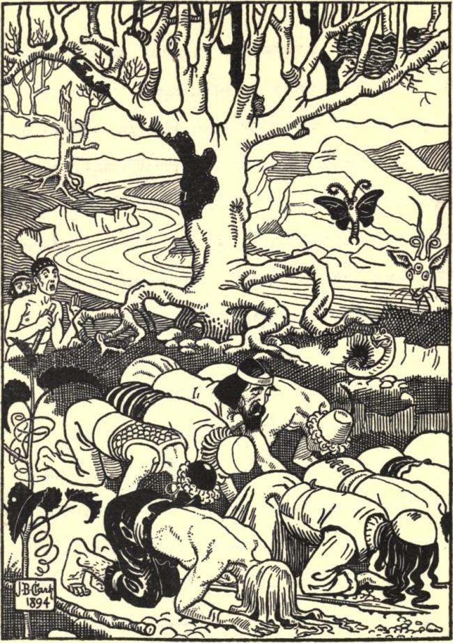 There were also near unto the place two portraitures cut out in a rock, the one of the quantity of an acre of ground, the other less, which made me imagine the lesser to be Bacchus and the other Hercules: and giving them due adoration, we proceeded on our journey, and far we had not gone but we came to a river, the stream whereof seemed to run with as rich wine as any is made in Chios, and of a great breadth, in some places able to bear a ship, which made me to give the more credit to the inscription upon the pillar, when I saw such apparent signs of Bacchus's peregrination. We then resolved to travel up the stream to find whence the river had his original, and when we were come to the head, no spring at all appeared, but mighty great vine-trees of infinite number, which from their roots distilled pure wine which made the river run so abundantly: the stream was also well stored with fish, of which we took a few, in taste and colour much resembling wine, but as many as ate of them fell drunk upon it; for when they were opened and cut up, we found them to be full of lees: afterwards we mixed some fresh water fish with them, which allayed the strong taste of the wine. We then crossed the stream where we found it passable, and came among a world of vines of incredible number, which towards the earth had firm stocks and of a good growth; but the tops of them were women, from the hip upwards, having all their proportion perfect and complete; as painters picture out Daphne, who was turned into a tree when she was overtaken by Apollo; at their fingers' ends sprung out branches full of grapes, and the hair of their heads was nothing else but winding wires and leaves, and clusters of grapes. When we were come to them, they saluted us and joined hands with us, and spake unto us some in the Lydian and some in the Indian language, but most of them in Greek: they also kissed us with their mouths, but he that was so kissed fell drunk, and was not his own man a good while after: they could not abide to have any fruit pulled from them, but would roar and cry out pitifully if any man offered it. Some of them desired to have carnal mixture with us, and two of our company were so bold as to entertain their offer, and could never afterwards be loosed from them, but were knit fast together at their nether parts, from whence they grew together and took root together, and their fingers began to spring out with branches and crooked wires as if they were ready to bring out fruit: whereupon we forsook them and fled to our ships, and told the company at our coming what had betide unto us, how our fellows were entangled, and of their copulation with the vines. Then we took certain of our vessels and filled them, some with water and some with wine out of the river, and lodged for that night near the shore.