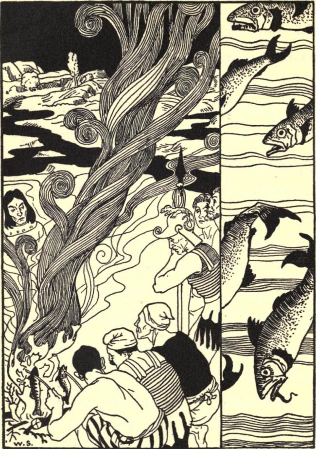 And we made her such answer as we thought would give her best content: and departing to our ship, reposed ourselves near unto the shore, and in the morning put to sea, where we were taken with a violent storm, which tossed us two days together, and on the third we fell among the Colocynthopiratans. These are a wild kind of men, that issue out of the islands adjoining, and prey upon passengers, and for their shipping have mighty great gourds six cubits in length, which they make hollow when they are ripe, and cleanse out all that is within them, and use the rinds for ships, making their masts of reeds, and their sails of the gourd leaves.