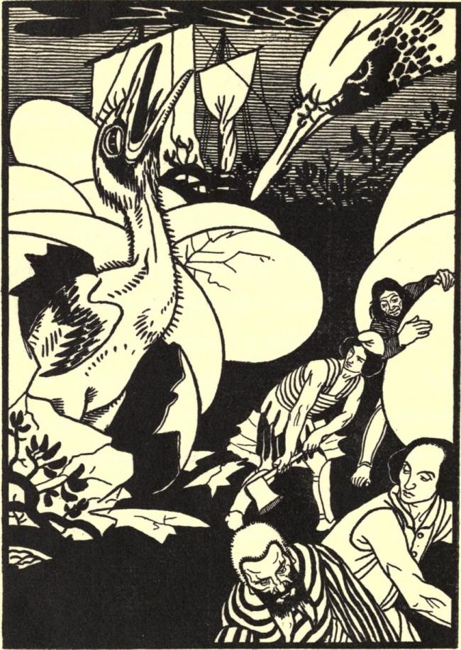 As soon as it was day, we got upon it, and found it to be a nest, fashioned like a great lighter, with trees plaited and wound one within another, in which were five hundred eggs, every one bigger than a tun of Chios measure, and so near their time of hatching that the young chickens might be seen and began to cry. Then with an axe we hewed one of the eggs in pieces, and cut out a young one that had no feathers, which yet was bigger than twenty of our vultures.