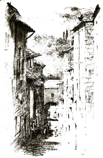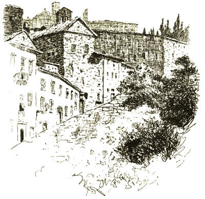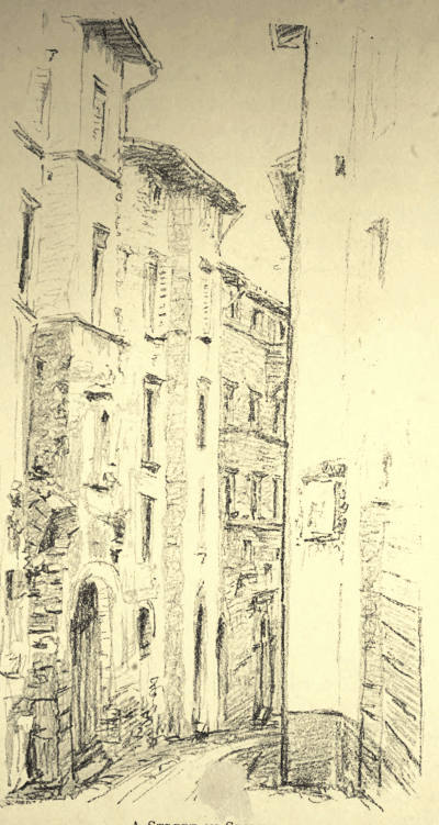But the chief glory of Viterbo is the romantic mediaeval city which lies between the Via Principe Umberto and the gates of the Carmine and San Pietro. Here even the names of the narrow and mysterious streets have not been changed by the rise of the House of Savoy. Would it not give a thrill even to the most unimaginative of travellers to step from the Square of the Dead into the Via di San Pellegrino with its grey thirteenth-century houses huddled on either hand, now flowering into Gothic windows and elegant outside staircases, now frowning defiance from square fighting towers with evil slits for eyes, now opening a passage down the steep hillside like the Street of a Hundred Bridges or the staircase street which leads to the Bridge of the Paradox?