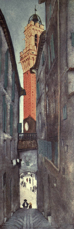 But I am persuaded that if you go there you will find a great content among the little cities of great memories which stand knee-deep in flowers upon the hills of Italy, or in those nobler towns,—Siena, who belongs to the Madonna, and Perugia, whose name is as a torch to light your feet into the Valleys of Romance. In their streets you are seldom shut away from the mountains and the sky; and little gracious weeds and grasses have spread a web among their stones as though an elfin world sought to entrap a monster and pull him down to ruin.
