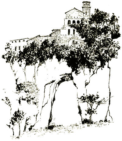 It was very early when we emerged from the frowning gate of the city and dipped down among the dewy vineyards. Beside the road an aqueduct rose out of the earth, a crumbling mass of ancient masonry. As we climbed down into the valley it towered above us, spanning the ravine, but when we toiled over the penitential stones of the Via dei Cappuccini, thankful for its shade as we mounted, it sank again into the hillside, and the leaping green things clambered upon it, eager to drag it back to the ditch. So we went leisurely through the play of light and shade, and always as we looked back we saw Orvieto rising sheer out of the valley like a queen on her brown rock. The morning mist wove a magic beauty round the spires of her Gothic cathedral and the giant pine-tree on the edge of her precipice, until she seemed the very city Turner immortalised.