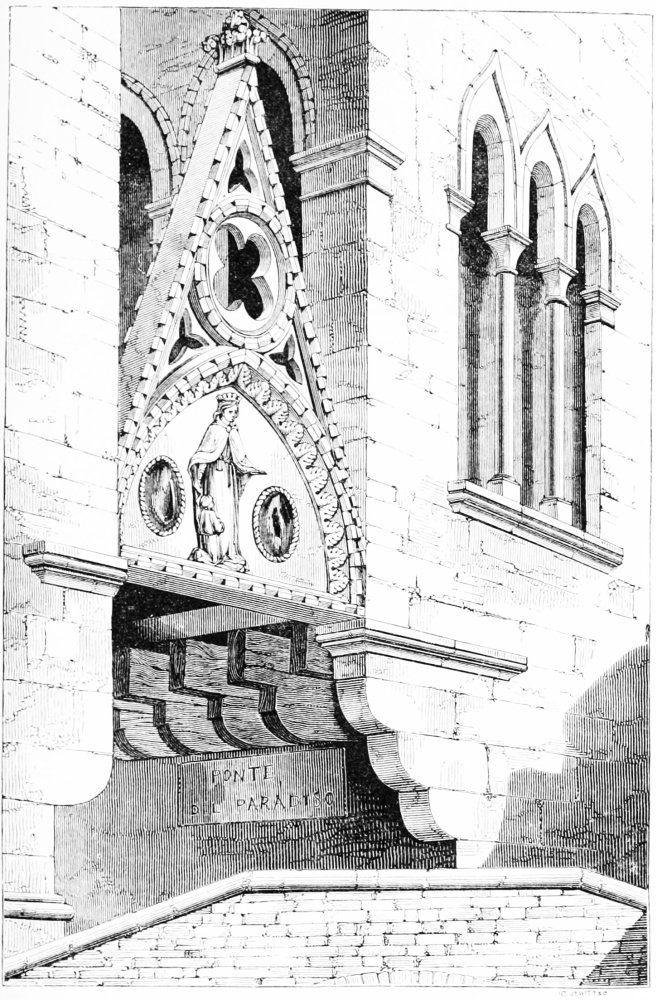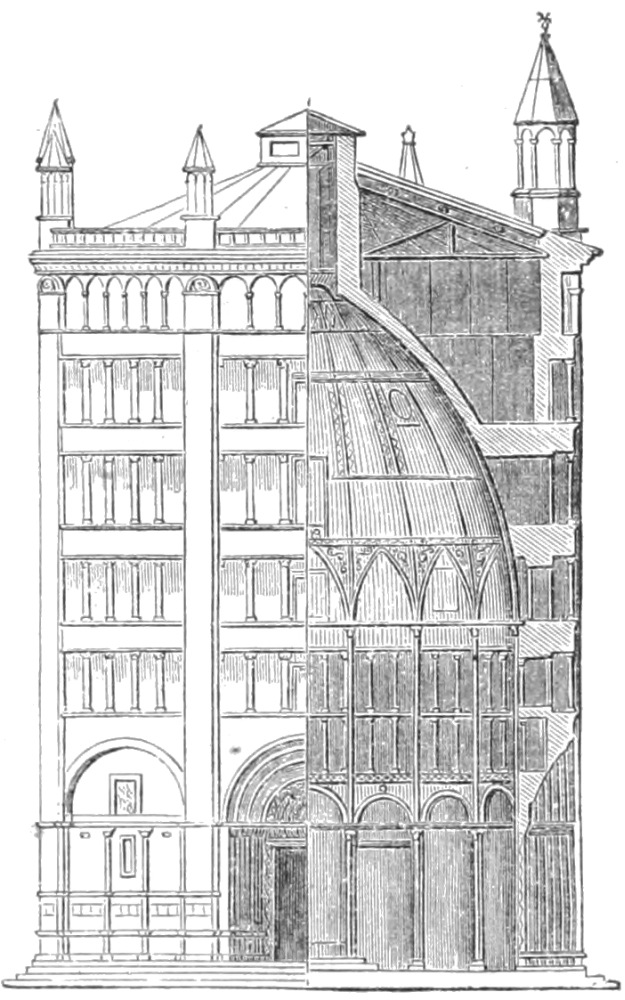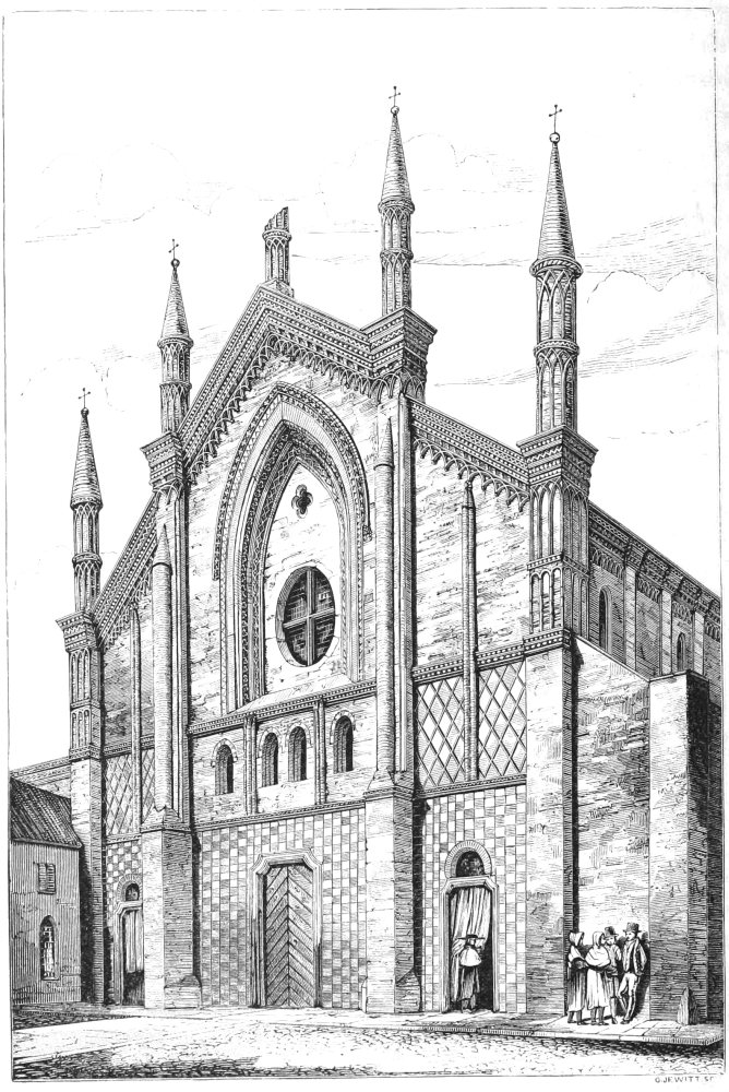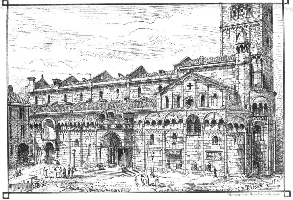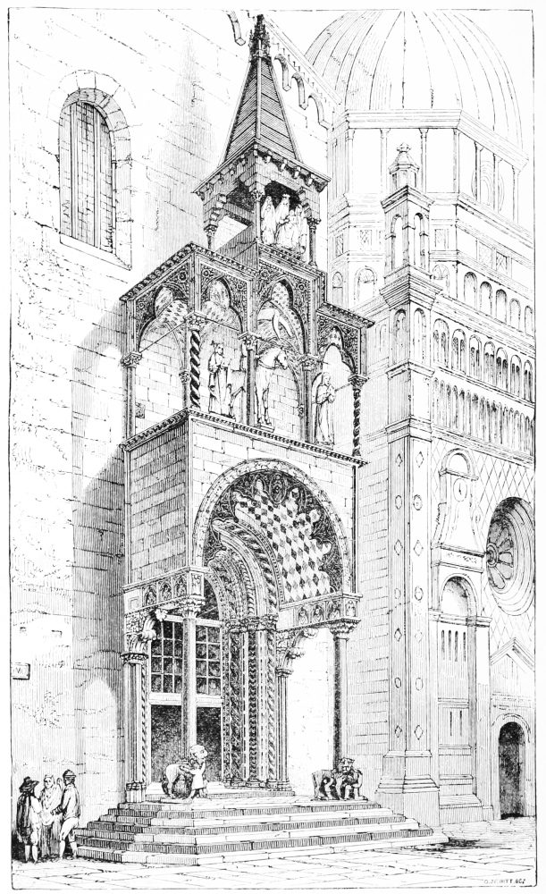 In past years I had travelled—rapidly, it is true, but not without learning much, very much, of what was useful—by the noble cities of Belgium, up the church-besprinkled banks of the fair Rhine, over the plains of Bavaria, and through much that was most noble and interesting in different parts of France and Germany; I had dreamt of old times and old men in the antique streets of Bruges and Nuremberg, and under the shade of the still more ancient walls of Regensburg, in the solemn naves of Amiens, of Köln, of Freiburg, of Strasburg and Chartres, and of many more most noble piles; I had paced the ruins of old abbeys, and studied, so far as I could, in all of them the science and the art of my forefathers; but so far all my time had been devoted to the study of Northern art, and I had found no time and no opportunity for the study of that modification of the pointed style which distinguishes the cities and the churches of the north of Italy. No wonder then that, with a prospect at last of a first sight of Italy and Italian architecture before me, I looked forward long and anxiously for the end of summer, for that happy autumn which brings ease and relaxation to so many a wearied heart; and that when at last, at the latter end of August, I found myself absolutely on my way, I was in no common degree disposed for the thorough enjoyment of all that I met with.