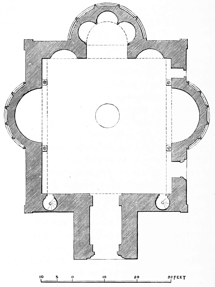 [68] The complete church was to have been 800 feet long, and 525 feet across the transepts, with a central dome 130 feet in diameter.—Fergusson’s ‘History of Architecture,’ ii. 210.