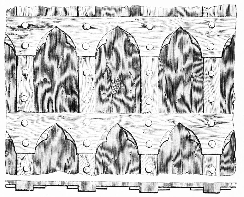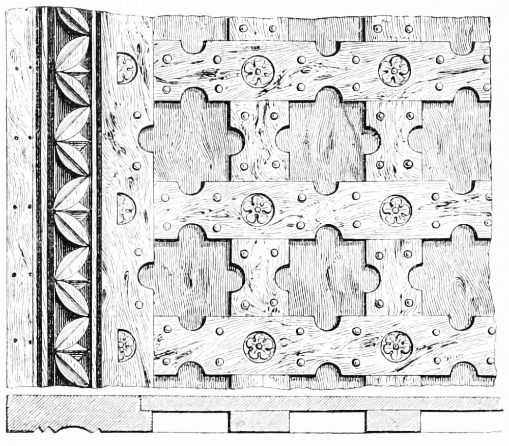 [72] When I first saw this I thought it was an entirely modern device. In 1871, however, in passing through France, I found at La Fère a church of flamboyant character, with all the cells of its groining covered with sunk traceries; and at Chambéry the painting on the roof of the Sainte Chapelle is said to be old.