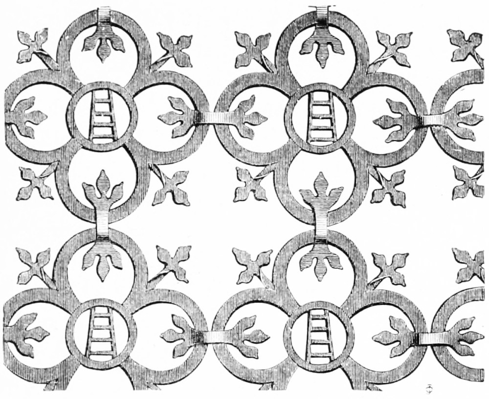 [19] This grille is worthy of especial notice. Instead of being hard and stiff, it is all linked together, so that it is more like a piece of chain mail than of iron railing. Its intricacy adds manifold to the effect of the group of tombs which it half conceals.
