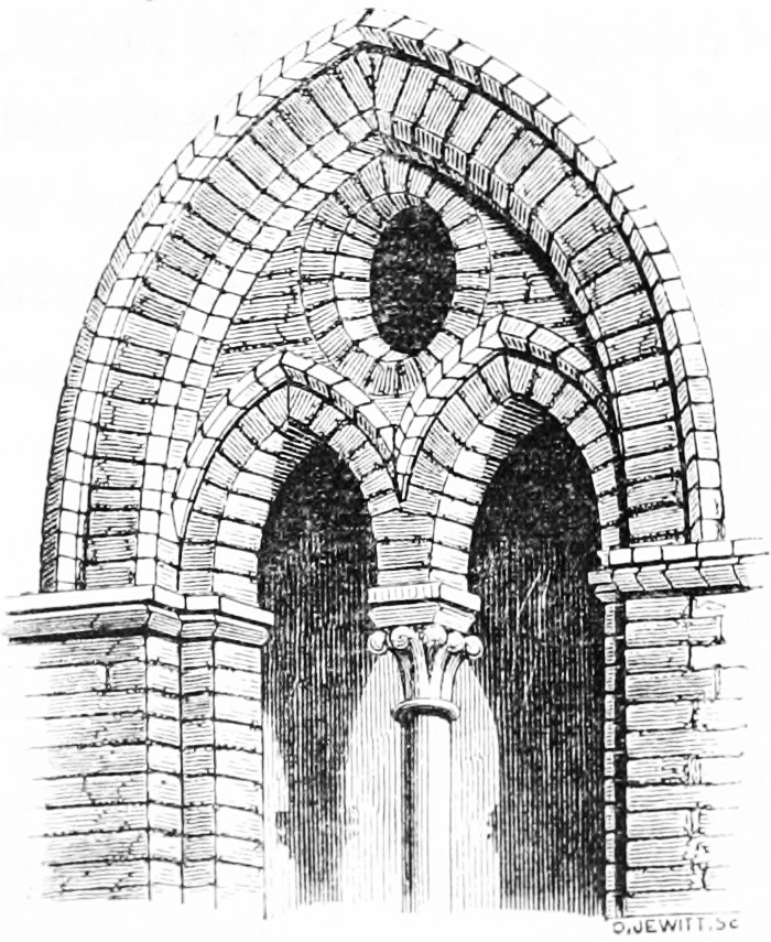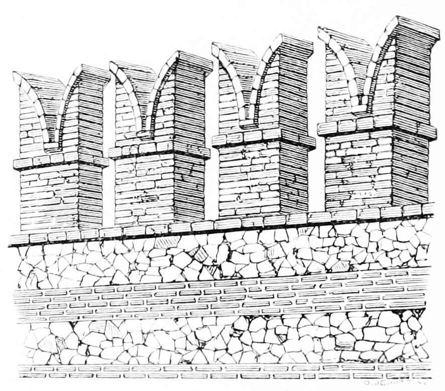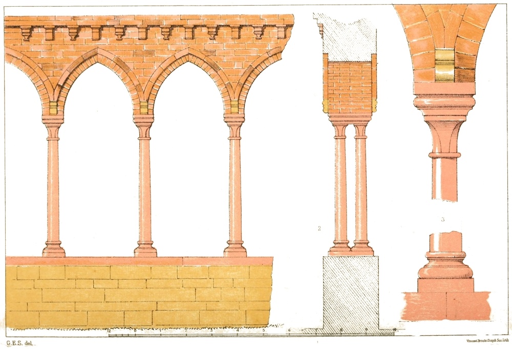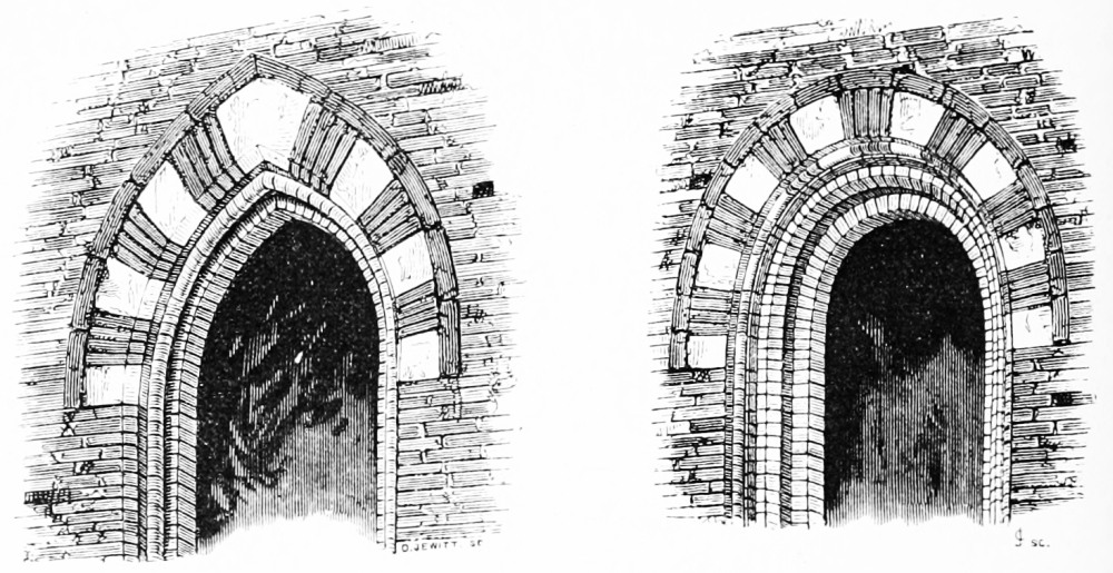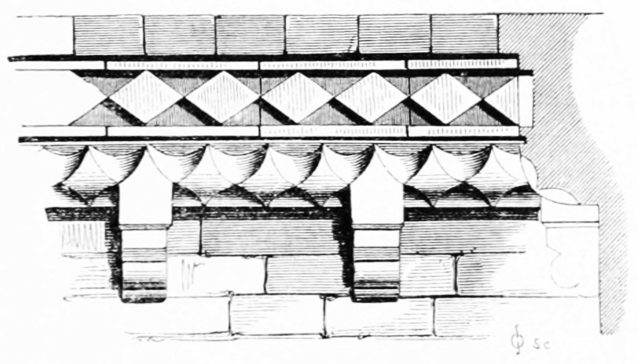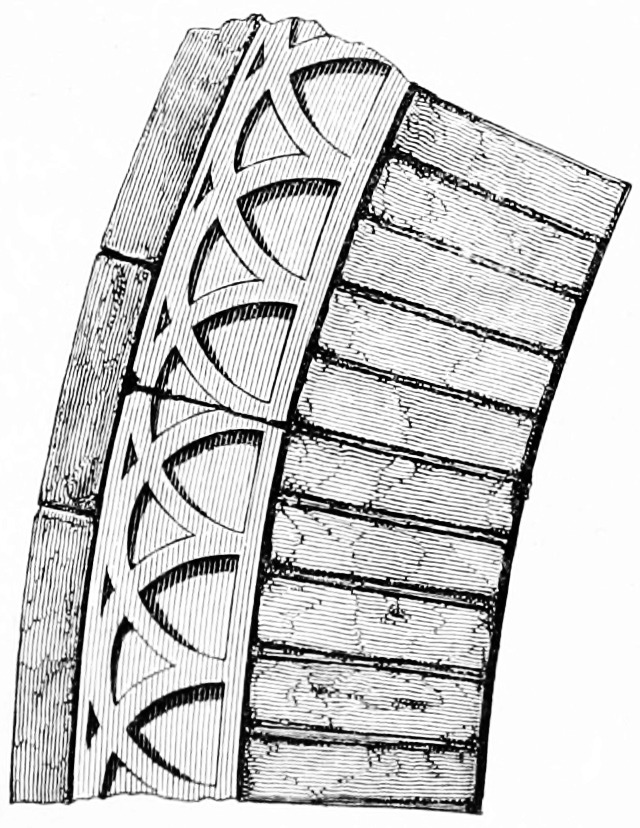 [38] The twelfth-century bricks here measure seven inches by two inches, and are built with a half inch mortar joint; they are of red and yellow colour, used indiscriminately, and, though good and lasting, extremely rough in their make.
