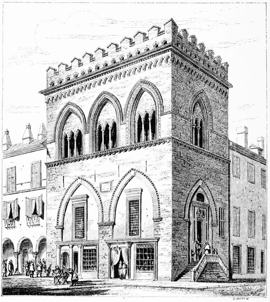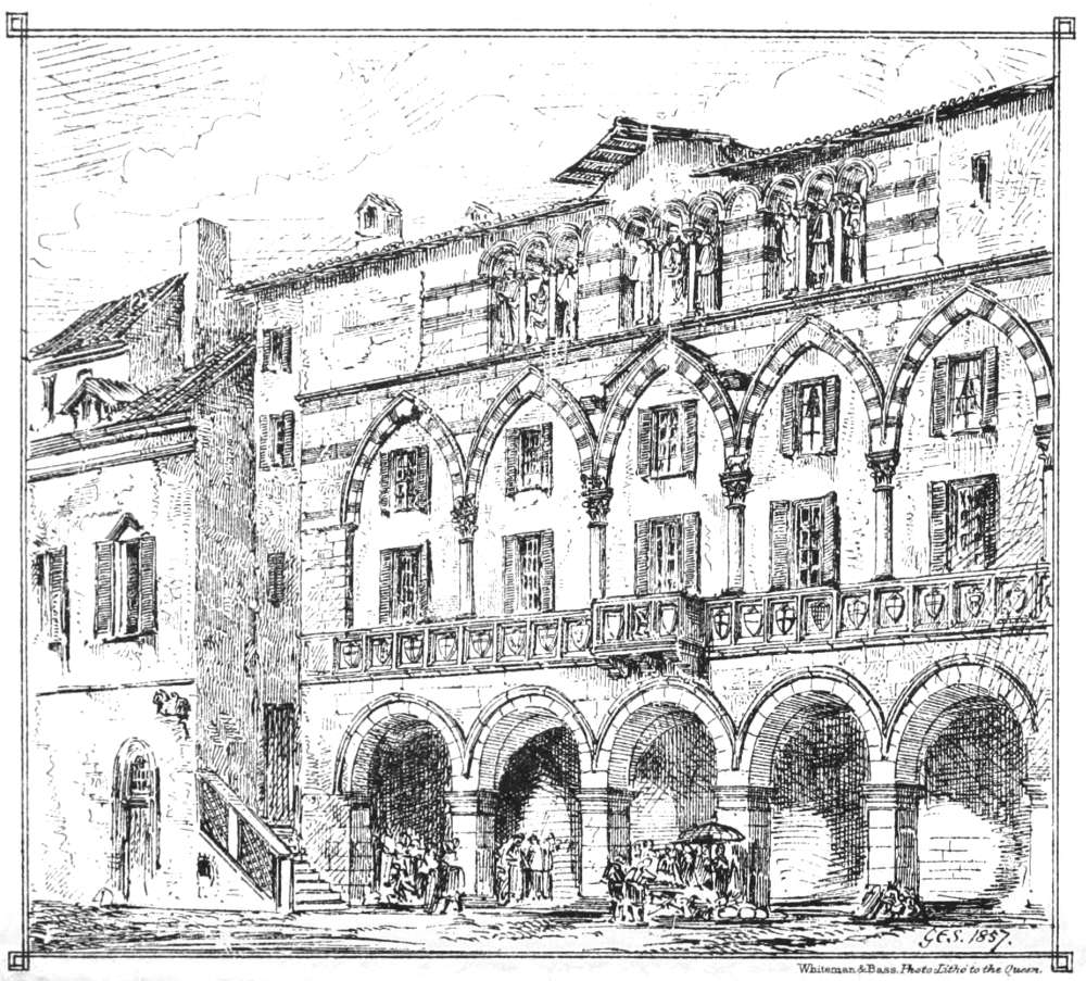 [56] This arrangement is not by any means unknown in Northern Europe, though certainly uncommon as compared with Italy, where it was almost universal. There is an example of the thirteenth century at Easby Abbey, Yorkshire, and another at Oakham Castle; whilst in France the ancient houses at Cluny all have it; and at Ratisbon, one of the most interesting cities in Germany, a great number of houses of the twelfth and thirteenth centuries, of prodigious architectural interest, have it.