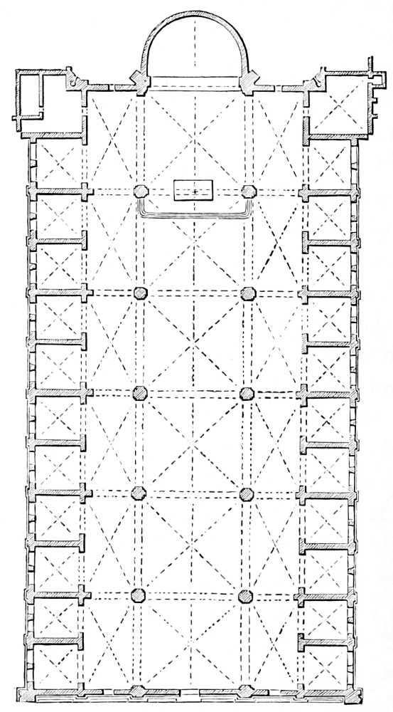 [29] The dimensions are worth giving to show how little this church owes to mere size. It is 245 feet long, 201 feet across the transept, and 170 feet across the west front. The height of the central cupola is 90 feet, and that of the west front 72 feet.