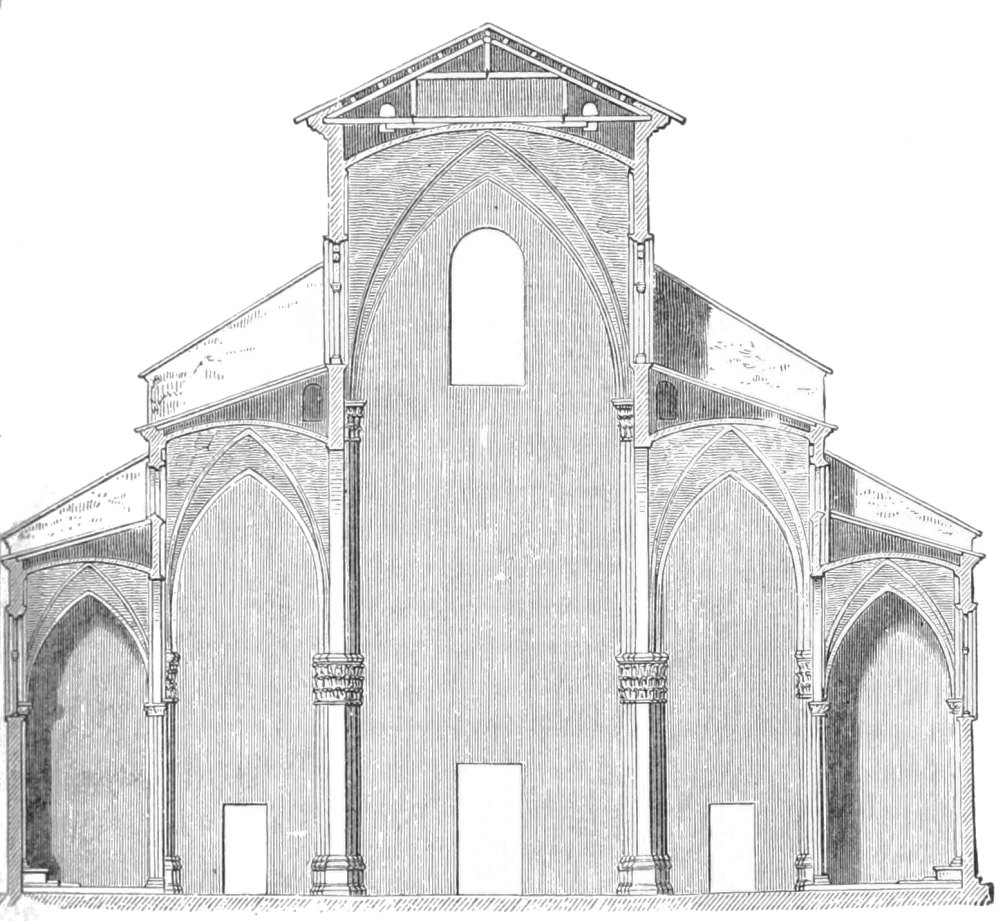It will be found in the following pages that in Italy there did not exist that distinction between the use of round and pointed arches which did exist for three centuries north of the Alps. They were content there to use whichever was most convenient, and whichever appeared to them to be most effective in its intended position. We therefore find, in most Italian mediæval buildings, round and pointed arches used in the same work, the former generally for ornament, the latter for construction; and the effect of this is in some degree to make us lessen the rigidity with which a study of Northern art might otherwise affect our views on this point. But I think no argument can be used by the lovers of the round arch which would ever go farther than to leave us open to the choice of both round and pointed arches, just as in these old Italian buildings: they have no right to say, “You may not use the pointed arch at all,” but they perhaps may be allowed to ask, “Why exclude for ever the round arch?” and then I should refer them to Italy for a proof that as a rule the mixture of the two is neither harmonious nor satisfactory; whilst at the same time I should go on to shew them that, when they talk of the virtues of Roman and Romanesque architecture, of the repose and the simplicity which distinguish them, of their grandeur and their general breadth and nobility of effect—in all these things they do but sing the praises of the best Italian architecture of the thirteenth and fourteenth centuries, and that in studying the style we may well be guided by it in what we do, not to the forgetfulness of the glories of our own land, but to the development in a forward direction of what we inherit from our forefathers of that architecture which, after a lapse of three centuries, we now see on all sides reviving with fresh vigour from its temporary grave, and which requires only prudence and skill on the part of its professors to make even more perfect than before.